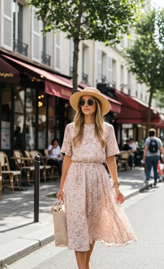 This outfit is pure summer bliss! The delicate pink floral dress is light and breezy, with a flattering mid-length that flows effortlessly as you walk. The loose fit makes it ideal for those hot summer days, offering both comfort and style. Paired with the dress is a wide-brimmed straw hat and chic sunglasses, adding a touch of elegance and a relaxed vibe. The nude heels and soft beige handbag complete the look, making it perfect for a stroll through a sunny Parisian street or a weekend brunch with friends.