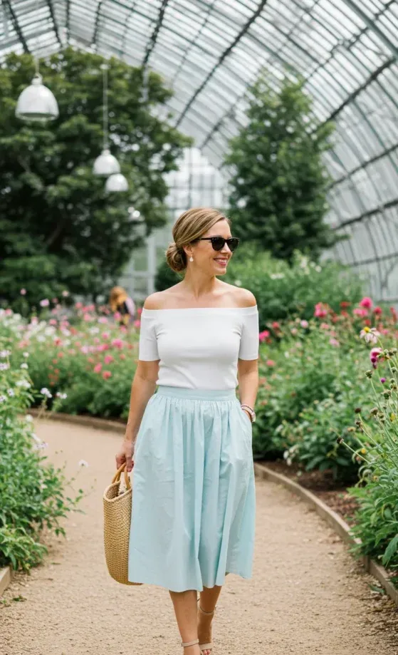 This outfit is all about comfort and elegance with a modern twist. The white off-shoulder top is simple yet chic, adding a touch of femininity while the flowing pastel blue skirt keeps things light and airy. The high-waisted skirt cinches at the waist, giving the outfit a flattering shape, while the soft fabric and light color scream summer. Paired with a woven bag and nude heels, this look is perfect for a day out at a garden, brunch with friends, or a leisurely walk through a sunny park.