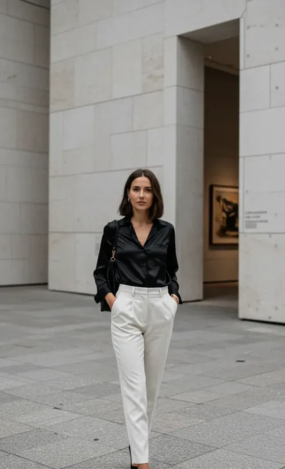 This black and white ensemble radiates sophistication with its chic simplicity. The outfit features a silky black button-up blouse, perfectly tucked into crisp white high-waisted trousers. The polished look is completed with pointed black heels, creating a contrast that is both sharp and classy. The sleek, minimalist vibe of the look, combined with the luxurious fabric of the blouse, makes it suitable for both business meetings and evening outings.