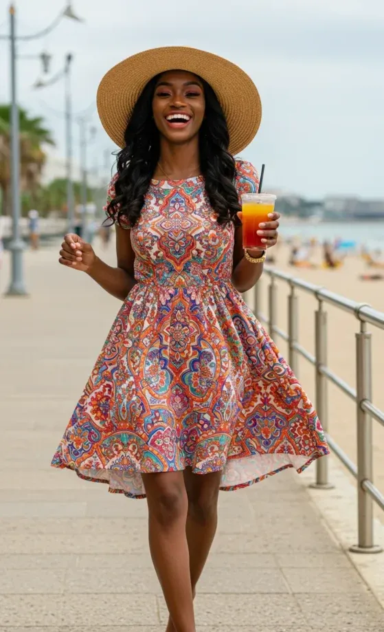 I absolutely adore how this outfit makes me feel like I m on a tropical vacation! The colors are so vibrant and happy, and the flowy design is perfect for staying cool and comfortable in the heat. The combination of the playful pattern, the hat, and the carefree barefoot look makes this outfit not only trendy but also perfect for embracing the summer spirit. It s the kind of outfit that feels light, fun, and full of life â exactly what I want for sunny days by the beach!