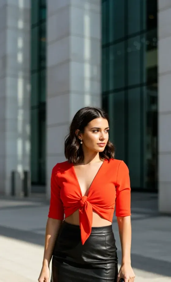 This outfit features a bold red crop top with a knot detail at the front, paired with a sleek black leather mini skirt. The crop top has a flattering square neckline and fitted short sleeves, creating a chic yet casual look. The leather skirt adds an edgy touch, and the black accessories, including a small handbag, complete the outfit in a sophisticated yet modern way.