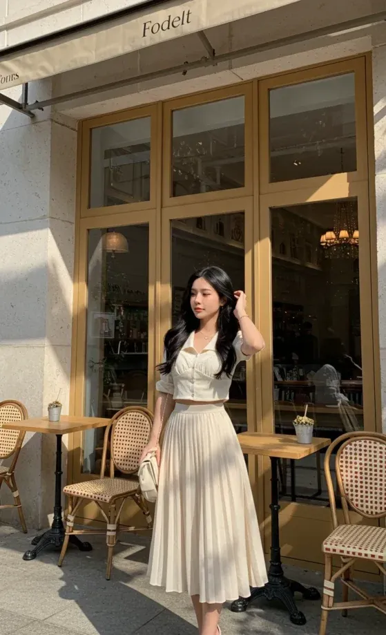 This beautiful outfit features a white, button-down crop top with short sleeves, paired with a flowy pleated skirt in a soft, light beige color. The outfit has a chic and feminine vibe with its gentle fabric movement, perfect for a sunny day out. The look is completed with simple yet elegant accessories and a small handbag, making it perfect for a casual coffee date or a stroll around town.