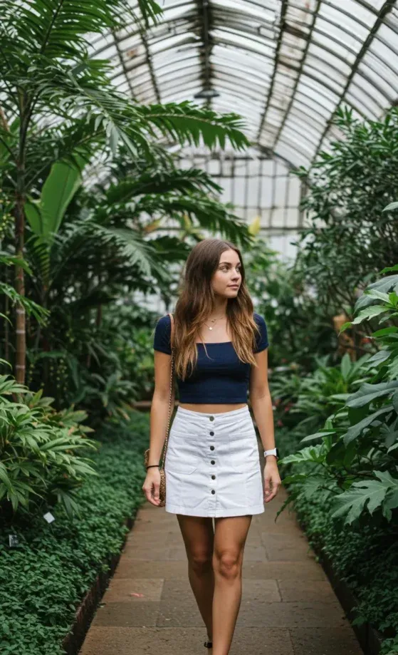 I absolutely love how this outfit blends relaxed and refined elements. The navy crop top is simple but flattering, and the white skirt adds just the right amount of freshness to make the whole look feel light and fun. The button details on the skirt give it a touch of retro charm, making this outfit not only on-trend but versatile. It s the kind of look I could wear anywhere, from a café date to a casual outing with friends it s all about keeping it stylish but comfortable!