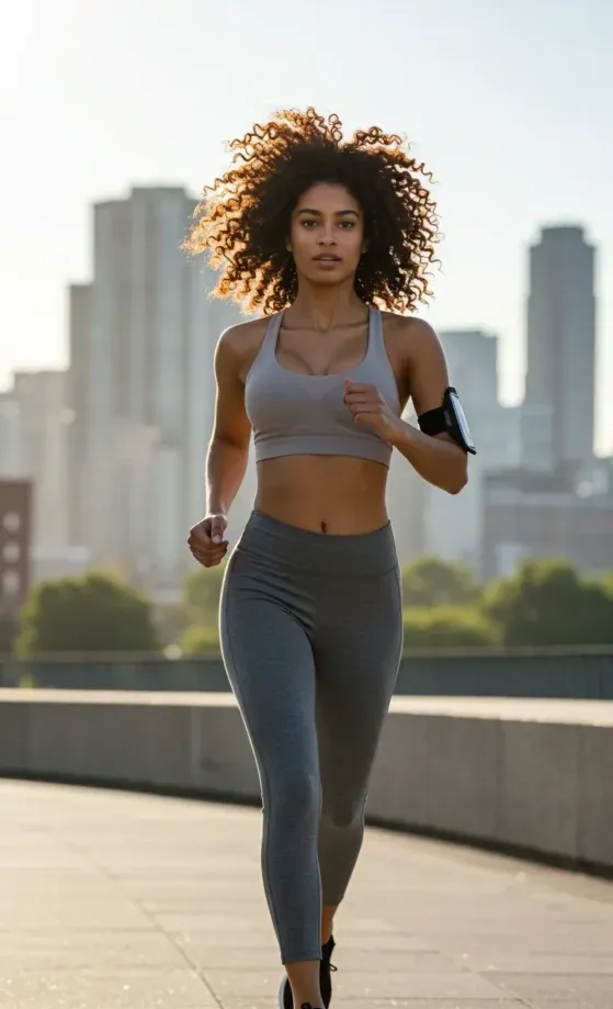 This athletic-inspired outfit includes a beige sports crop top and matching high-waisted leggings, perfect for a workout or casual athleisure look. The fitted crop top offers comfort and support, while the leggings feature a sleek design that flatters the figure. Paired with sneakers and a fitness armband, the outfit is both practical and stylish, ideal for outdoor runs or a morning jog through the city.