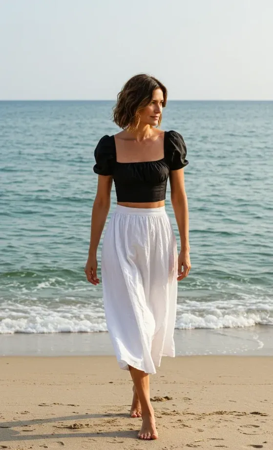 This chic and effortless outfit features a black puff-sleeve crop top paired with a flowy white skirt, perfect for a breezy beach day. The crop top has a fitted waist and a square neckline that creates a flattering silhouette, while the skirt offers a relaxed and airy vibe, ideal for walking by the ocean. The minimalist black and white combination keeps things simple yet stylish, and the casual look is completed with a natural beachy hairstyle.