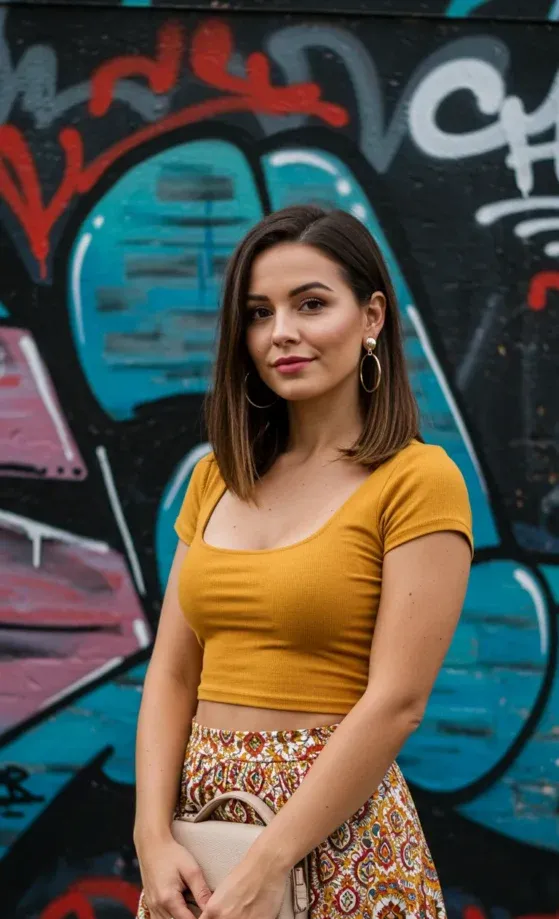 This effortlessly chic outfit features a mustard yellow crop top with a simple scoop neck and short sleeves. It s paired with a flowy floral skirt in earthy tones of red, orange, and beige, giving it a vibrant and fun vibe. The look is completed with a simple crossbody bag, minimal jewelry, and natural waves, making it perfect for a casual day out or even a brunch date in the city.