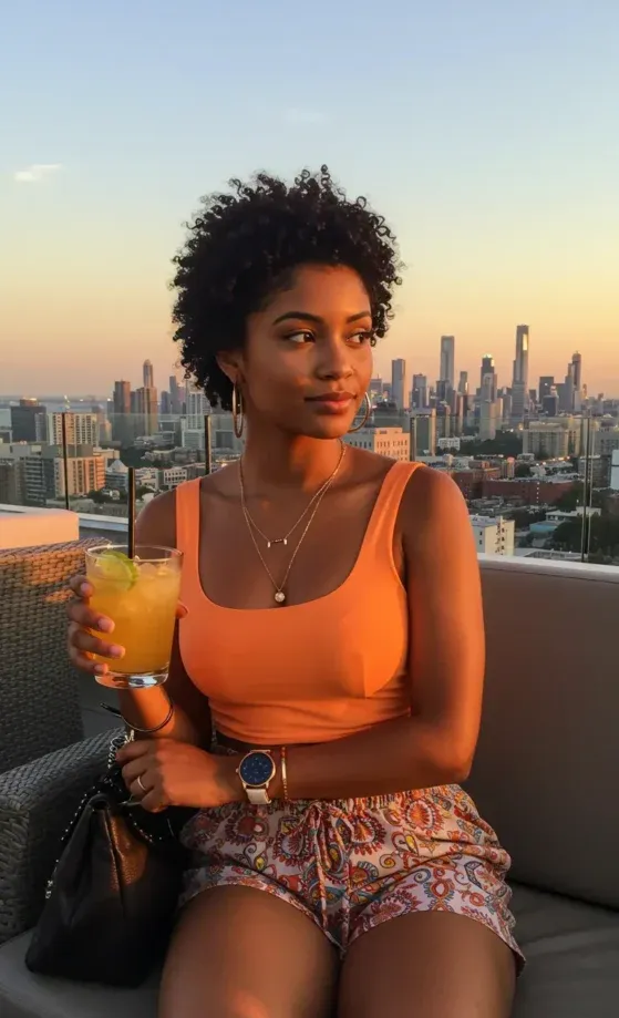 This bright and bold outfit is perfect for a sunny day out, offering both style and comfort. The orange crop top stands out with its vibrant hue, perfectly complementing the playful, bohemian-inspired printed shorts. The laid-back look is accessorized with gold hoop earrings, a stylish watch, and a chic black handbag, making it a balanced combination of fun and sophistication. The drink in hand and the city skyline background add an effortlessly cool vibe to this ensemble.