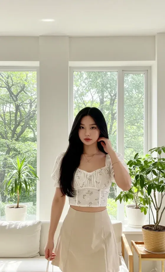 This outfit is the perfect blend of casual and cute! A delicate white crop top with floral embroidery pairs effortlessly with a soft beige skirt, creating a fresh and light summer look. The puffed sleeves and button-down front of the top add a feminine touch, while the A-line shape of the skirt makes it comfy and flattering for all body types. A simple woven bag completes the look, adding a bit of texture and practicality.