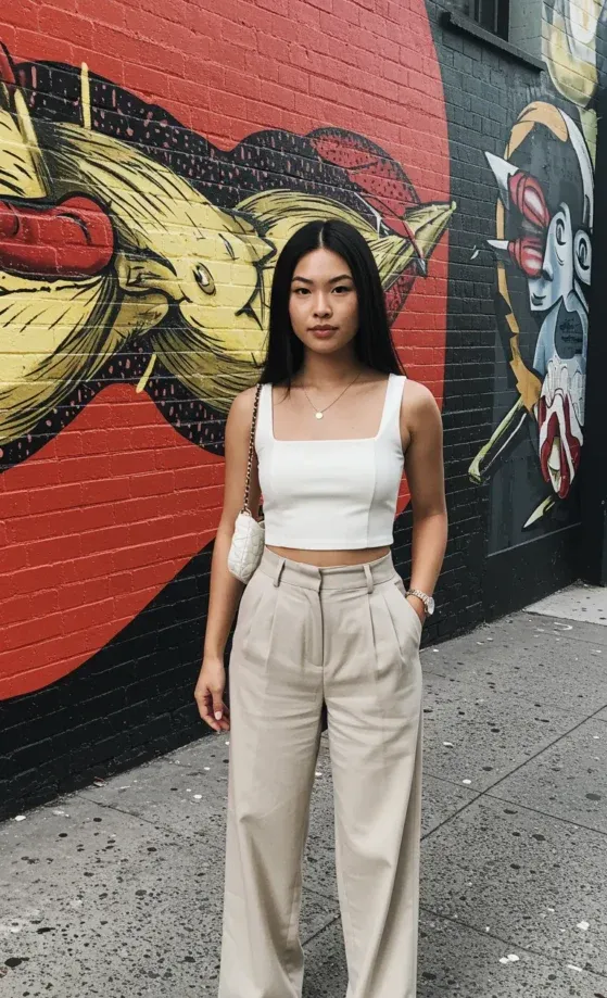 I absolutely love how this outfit feels effortlessly chic! The neutral tones make it versatile enough for any occasion, from a casual brunch to an afternoon of running errands in style. The wide-leg trousers give it a touch of elegance while the crop top adds just the right amount of youthful energy. It’s definitely one of those looks that you can wear on repeat without ever feeling basic.