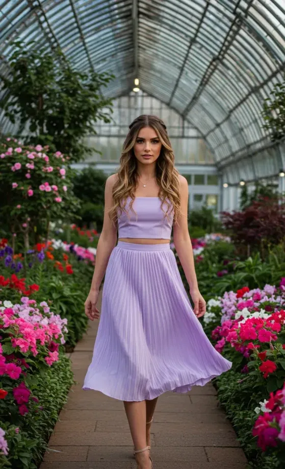 This gorgeous lavender ensemble is the epitome of easy-going elegance. The crop top hugs the body comfortably with a modern, minimalist design, while the pleated skirt sways gracefully as you walk. It s paired with soft strappy sandals, creating the perfect balance between casual chic and feminine charm. The pastel purple shade, surrounded by lush greenery and vibrant flowers, makes this outfit ideal for a summer garden party or a day out in nature.