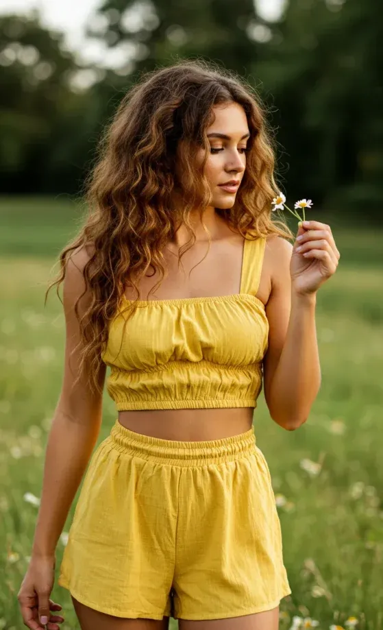 This vibrant outfit features a sunny yellow crop top with a smocked design, paired with matching yellow high-waisted shorts. The top has a square neckline and adjustable straps, giving it a flattering, fitted look, while the shorts have an elastic waistband for a comfortable fit. The fresh and light color adds to the fun, summer vibe, and the simple yet chic accessories complete the look perfectly.