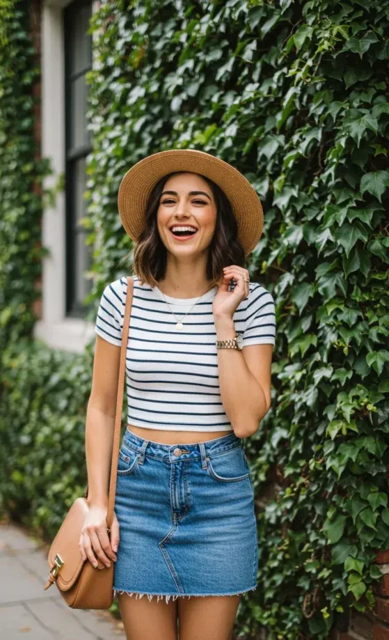 This outfit exudes effortless charm with a striped crop top and a classic denim skirt. The top, featuring a crisp white base and navy stripes, pairs perfectly with the high-waisted, frayed hem skirt that hits just above the knees. Accessories like a stylish tan crossbody bag, a delicate necklace, and a wide-brimmed hat complete the look, making it ideal for sunny strolls or casual meet-ups.