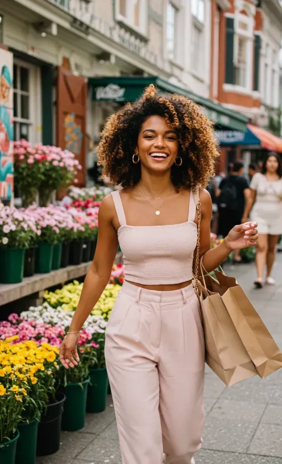 This outfit combines a soft blush pink crop top with a flattering square neckline and a pair of high-waisted pleated pants in a matching neutral shade. The top has delicate straps and a simple yet elegant design, while the pants add a chic, flowy touch with a relaxed, comfortable fit. Paired with a small shoulder bag and a radiant smile, this look is perfect for a casual day out shopping or a lunch date in the city.