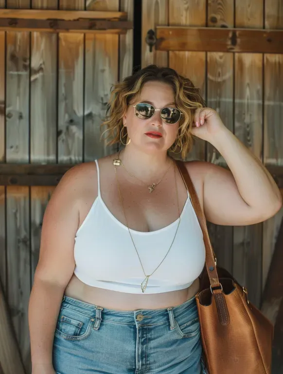 This laid-back, yet chic summer outfit is a perfect blend of comfort and style. A simple white crop top paired with high-waisted denim shorts brings that effortless vibe, while the accessories take it up a notch. Oversized sunglasses and a tan leather handbag are the perfect finishing touches for this sunny-day look. The soft curl in the hair and relaxed fit of the outfit give it that easy, carefree feeling we all crave in the warmer months.