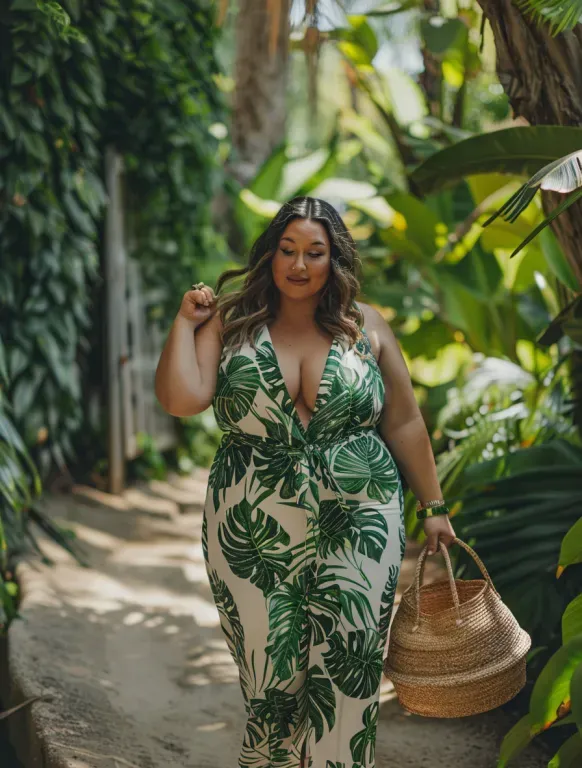 This tropical-inspired jumpsuit is a bold and fun statement piece perfect for summer adventures. The large leafy print in vibrant greens against a cream backdrop gives it that vacation-ready vibe. The deep V-neckline and cinched waist show off curves in a flattering way, while the wide legs offer comfort and freedom of movement. Paired with a simple straw bag and sandals, this outfit is effortlessly chic and perfect for a day out in the sun.