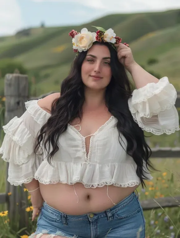 This outfit exudes effortless boho vibes, perfect for a relaxed summer day. The flowy, off-shoulder white blouse with puff sleeves is a statement piece, enhanced by the delicate lace trim. Paired with denim shorts, it keeps the look casual yet stylish. To top it off, the floral headband adds a whimsical touch that ties everything together, making this outfit ideal for a sunny outdoor gathering or a stroll through the park.