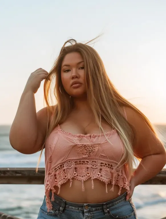 This boho-inspired outfit features a beautiful crochet pink top with delicate fringe details, paired with high-waisted denim shorts. The crochet design adds texture and a touch of femininity, while the relaxed fit and low neckline create a breezy, laid-back vibe. The denim shorts keep it casual and easygoing, making this outfit perfect for a sunny day at the beach or a stroll by the pier.