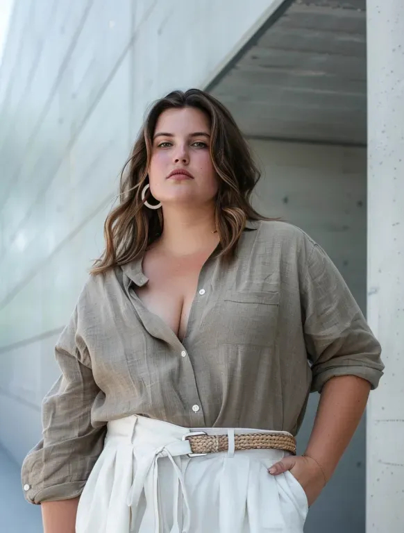 This outfit combines the laid-back vibes of summer with an effortlessly stylish touch. The loose-fitting, beige button-up shirt offers a relaxed silhouette that contrasts beautifully with the crisp white high-waisted shorts. A woven belt adds texture and defines the waist, while the minimalist styling of this outfit keeps it chic and timeless. It s perfect for a sunny day out when you want to stay cool but still look put-together.