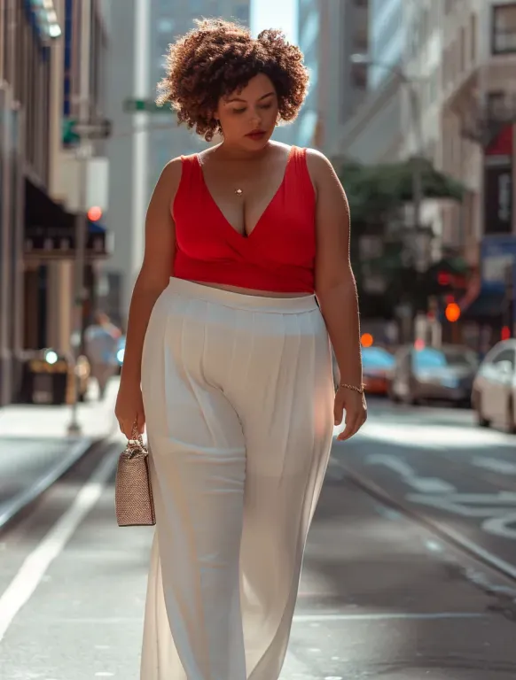 This outfit combines the best of casual chic and refined elegance. The bright red, deep V-neck top exudes confidence and femininity, perfectly complemented by the flowy, high-waisted white pleated pants that elongate the legs. The neutral yet stylish color combination keeps it classy, while the loose-fitting pants provide ultimate comfort. A small, metallic handbag and strappy sandals elevate the look, making it ideal for both casual outings and semi-formal events.