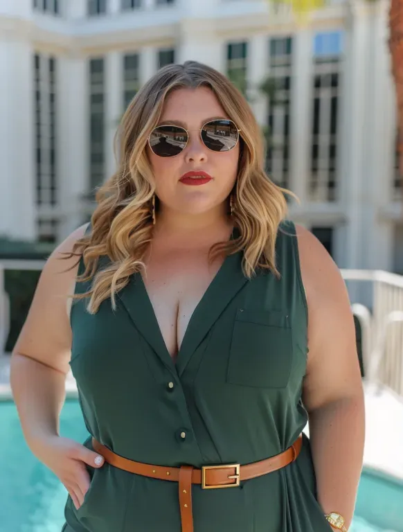 This chic green jumpsuit is perfect for a relaxed yet polished look. The deep V-neckline and belted waistline create a flattering shape while maintaining comfort, and the sleek, solid color makes it an elegant option for a variety of occasions. The button-down front adds a touch of sophistication, while the brown belt and accessories give it just the right amount of contrast. Paired with trendy sunglasses, this jumpsuit is effortless yet bold, ideal for a day out or a dinner with friends.