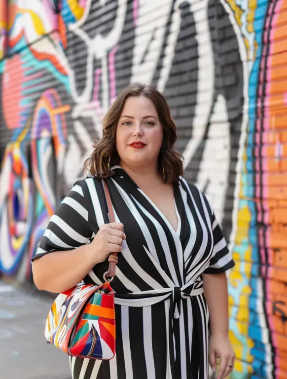 I love how this outfit combines a graphic, statement-making pattern with a laid-back, easy-to-wear fit. The stripes are bold but not overwhelming, and the tie waist cinches the dress in a way that flatters the curves without feeling too tight. Plus, the colorful bag adds a pop of excitement, breaking up the monochrome and making the whole look feel fresh. It s a perfect mix of style and comfort, and I can totally see myself rocking this on a sunny day while still feeling confident and stylish. This is the kind of outfit that makes you look effortlessly cool while feeling like you’re ready to take on the day!