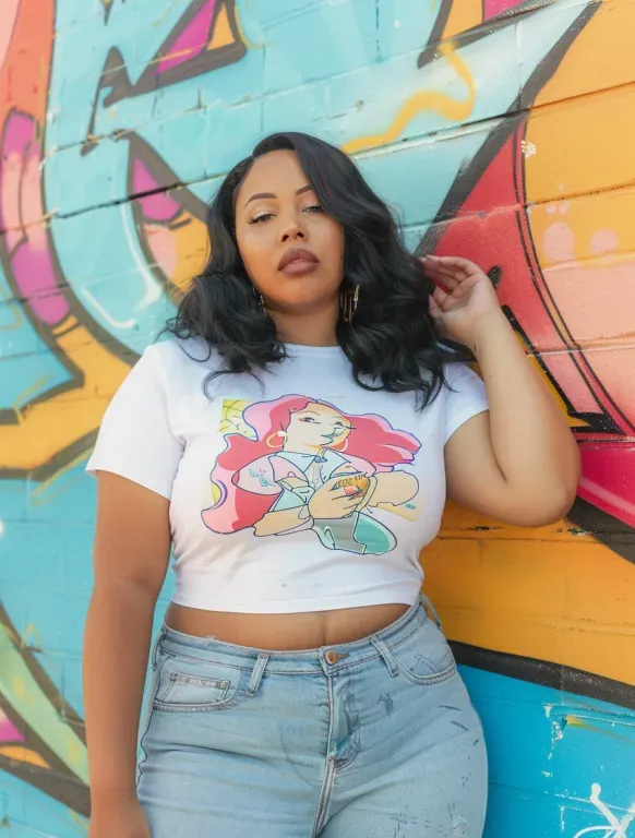 This fun, laid-back outfit features a white graphic tee with a bold illustration of a playful character, paired with light blue high-waisted jeans. The tee is cropped to highlight the waist, giving it a modern and chic vibe. The faded jeans, with a relaxed fit and slight distressing, create a perfectly casual look, while the gold accessories, including hoop earrings, add a touch of glam. The pop of color from the graphic print contrasts beautifully against the neutral tones of the jeans and background, making it perfect for a day out or a casual hangout with friends.