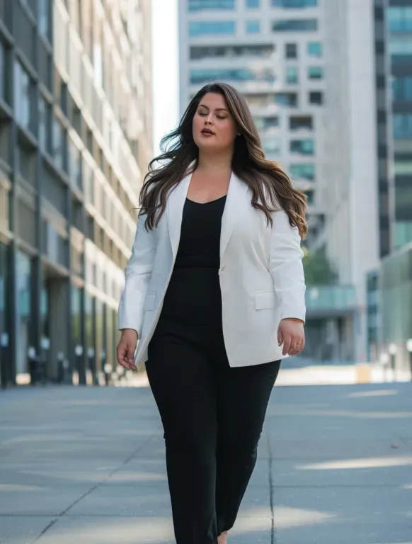 This classic black and white ensemble is all about confidence. The crisp white blazer with a structured fit contrasts beautifully against the sleek black trousers, creating a polished and powerful look. The tailored cut of the blazer and the high-waisted trousers accentuate the figure, making this outfit perfect for professional or dressy events. Pair it with simple black heels, and you’ve got a timeless, chic outfit that s both modern and sophisticated.