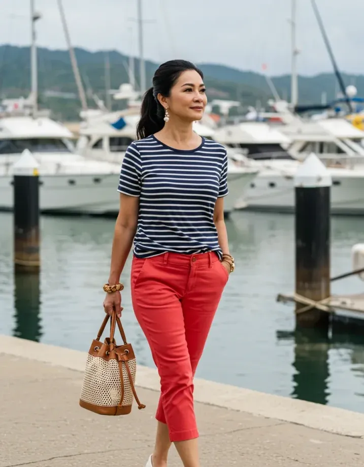 What I love most is how classic this outfit feels with just the right twist. The stripes and loafers say boat day chic,â but those coral pants make it feel fun and modern. This is the kind of look I d throw on for a casual lunch by the water or a relaxed summer stroll. It s cute, colorful, and completely confidence-boosting.