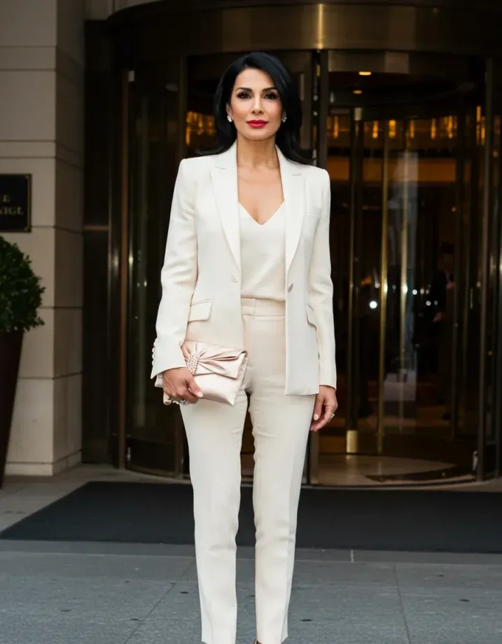 This outfit is the ultimate power move in soft tones. She s wearing a perfectly tailored ivory suit with slim-fit trousers and a matching blazer layered over a delicate satin cami. The look is polished with satin heels and a blush pink clutch topped with pearl detailing pure sophistication from head to toe. Her sleek waves, bold red lip, and sparkling earrings add a glamorous edge to the entire look.