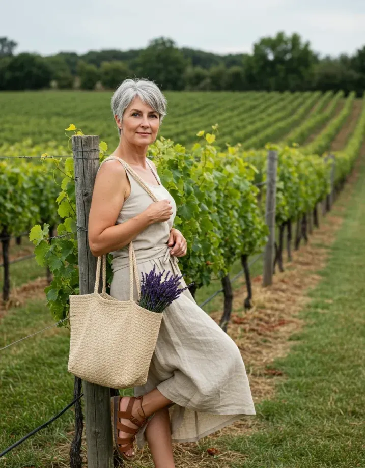 This outfit is earthy, breezy, and beautifully simple. She s wearing a sleeveless midi-length linen dress in a soft beige tone, tied gently at the waist for shape. Her strappy brown sandals are casual and comfy, and she s carrying a woven straw tote with a bunch of fresh lavender peeking out how cute is that? Her short silver pixie cut adds an effortlessly modern edge to the whole look.