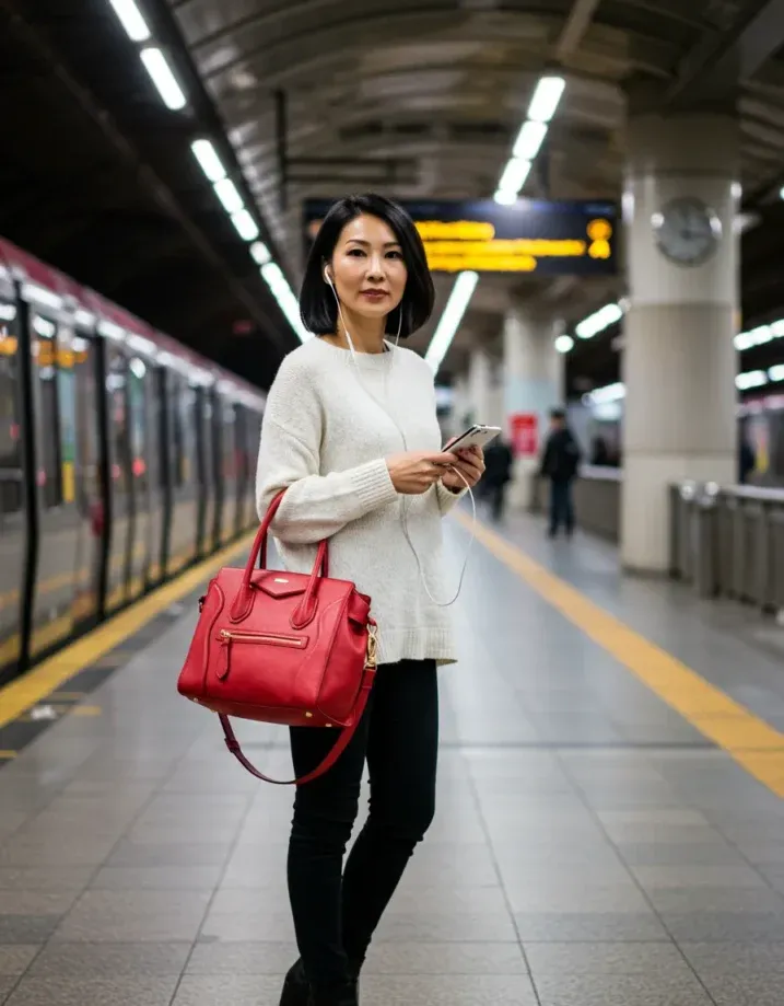 This look is the definition of casual cool. She s wearing a cozy off-white sweater that s perfectly slouchy without feeling oversized, paired with sleek black skinny jeans that keep the silhouette sharp. Black ankle boots give it a polished edge, but the star of the show? That bold red handbag it adds instant energy and personality to the whole look.