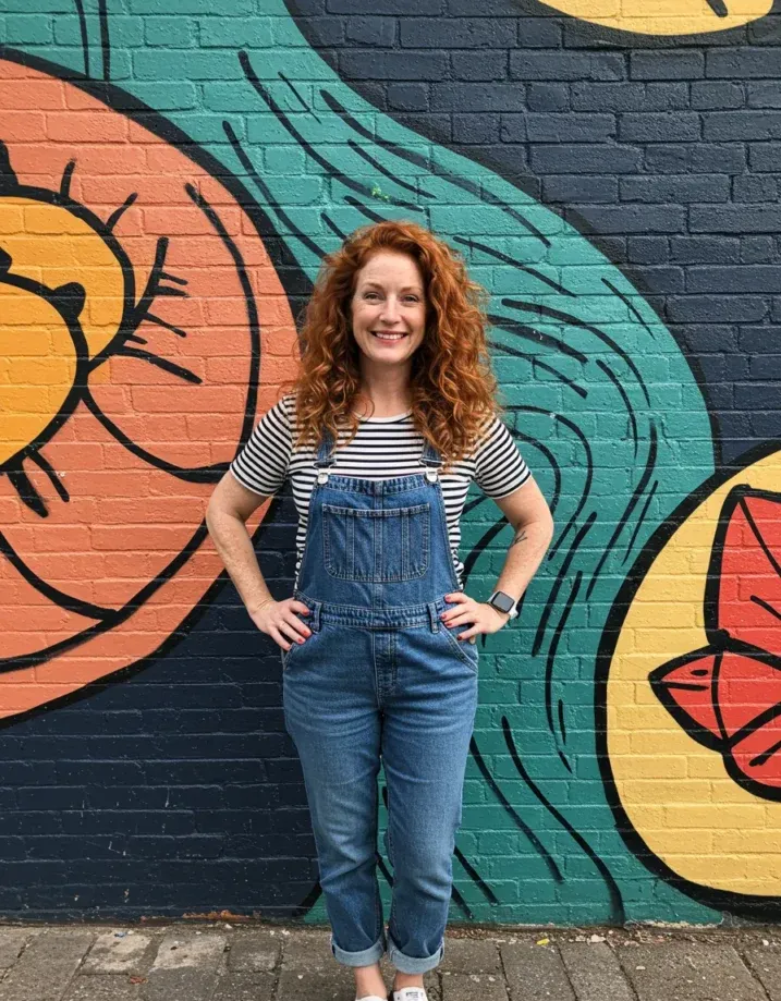 This look is the definition of laid-back and lovely. She s rocking a pair of medium-wash denim overalls with rolled-up cuffs that give it a relaxed, weekend-ready vibe. Underneath is a classic black-and-white striped tee that adds a fun, graphic pop. White sneakers keep it comfy and casual, while her natural red curls and fresh smile bring all the personality. Simple accessories like a smartwatch and bright nails finish the look without complicating it.