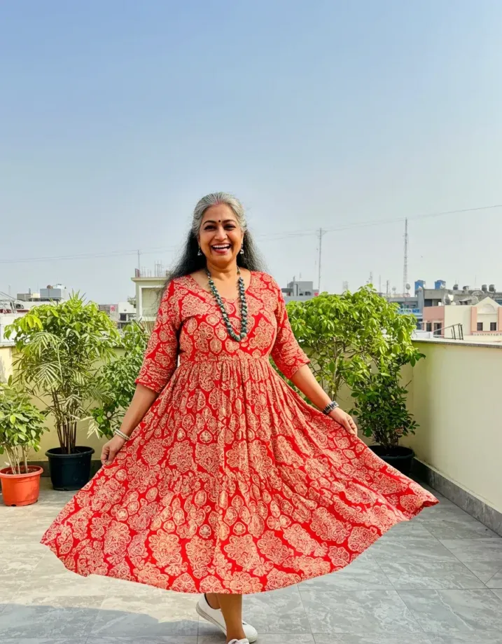 This vibrant outfit is all about joy, color, and confidence. The red dress flows beautifully with its full, swishy skirt and three-quarter sleeves. It’s covered in a traditional-style print that adds visual interest without being too loud. Paired with comfy white sneakers and a chunky green beaded necklace, the look is both playful and practical. Her long silver hair and bright smile just complete the vibe perfectly.