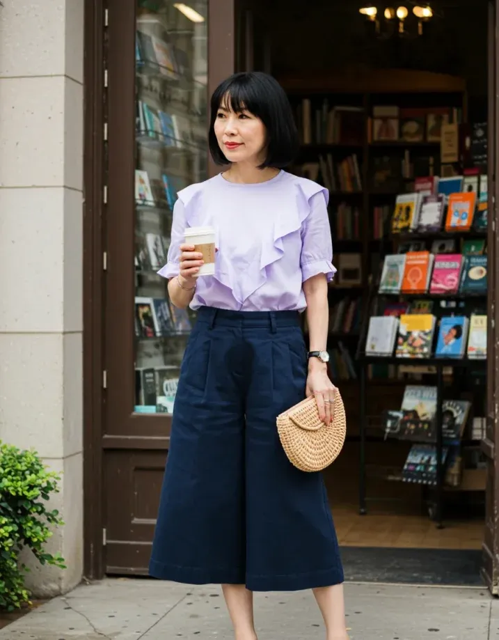 This look is the definition of polished and playful. She s wearing a soft lavender blouse with subtle ruffle details that add just the right amount of feminine charm. It s tucked into a pair of high-waisted, wide-leg navy culottes that bring instant structure and movement. Nude slide-on heels elongate the legs, while the straw clutch adds a fun, textured twist. Her sleek bob and red lipstick keep the look modern and refined.