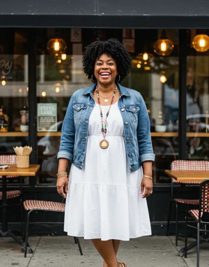 What makes this outfit so great is how easy it feels without being boring. The white dress is such a staple, and the denim jacket keeps it grounded while still feeling fresh. I love the extra touch of statement jewelry too it shows confidence and creativity. It s the kind of outfit I d wear to brunch, the farmers market, or honestly just to brighten up a cloudy day. Simple, stylish, and full of happy energy.