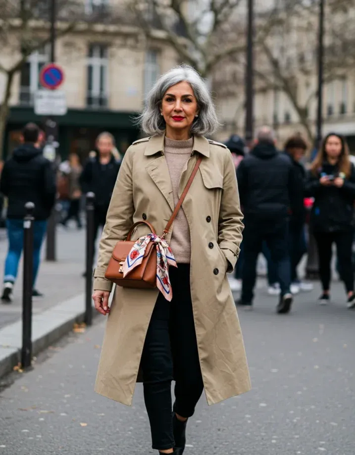 This outfit is timeless, elegant, and oh-so-effortless. She s layered a classic beige trench coat over a soft taupe sweater and fitted black pants. Sleek black ankle boots keep the silhouette streamlined, while a structured brown handbag adds warmth and sophistication. The printed silk scarf tied to the bag is the perfect finishing touch just enough color and personality without taking over.