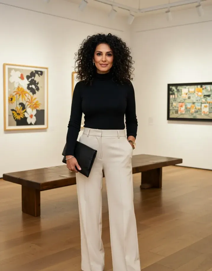 This outfit is all about chic confidence. A fitted black turtleneck sets the tone clean, classic, and endlessly flattering. It s tucked into high-waisted cream trousers with a wide-leg silhouette that adds elegance and structure. The accessories elevate things even more: a black clutch keeps it sleek, and the leopard print heels bring just the right dash of fun without stealing the show. Her voluminous curls and subtle gold jewelry round off the look with a luxurious finish.
