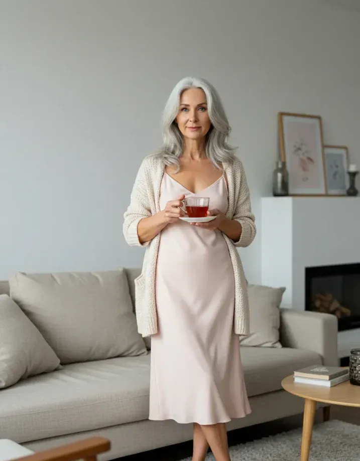 This look is all about soft elegance and quiet confidence. She s wearing a silky blush-toned slip dress that flows beautifully and feels effortlessly feminine. Over it, a chunky knit cardigan in warm cream adds cozy texture without overwhelming the outfit. The color palette is dreamy and minimal, creating a calming vibe that fits perfectly in a chic living room or a slow morning moment. Her silver hair frames her face beautifully, adding even more softness to the entire look.