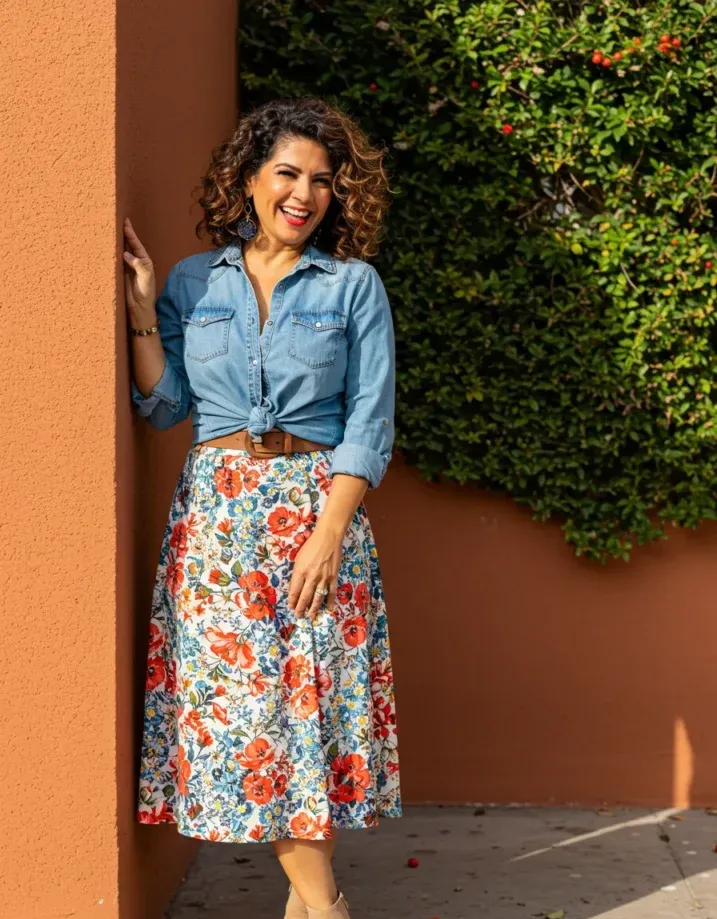 I can t get over how fresh and full of life this outfit feels. The tied-up denim shirt makes it youthful without trying too hard, and that floral skirt? Absolutely gorgeous. It s the kind of look that makes people smile when they see you bright, warm, and confident. If I could bottle up sunshine and turn it into an outfit, this would be it.