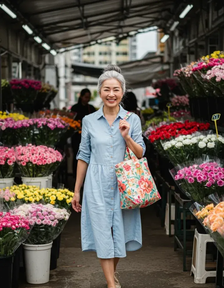This outfit is fresh, cheerful, and made for market mornings. She s wearing a light blue button-down shirt dress that falls just below the knee with a soft, flattering shape. The sleeves are casually rolled up, and she s paired it with comfy beige sneakers for an easygoing vibe. The star accessory is her bold floral tote colorful, bright, and full of personality.