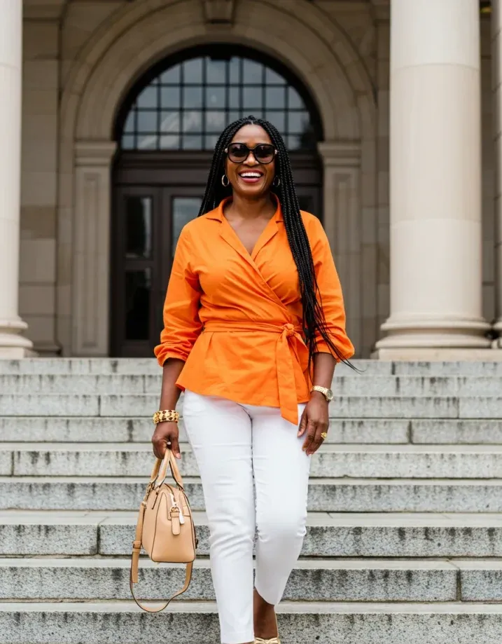 This outfit is sunshine in clothing form. She s wearing a bold orange wrap top that cinches at the waist and flatters the figure with a perfect little tie. Paired with fitted white ankle pants, the contrast is crisp, clean, and so eye-catching. Gold ballet flats and chunky bracelets add a bit of glam, while the structured beige handbag pulls it all together in style. Oversized sunglasses and hoop earrings finish it off with total confidence.