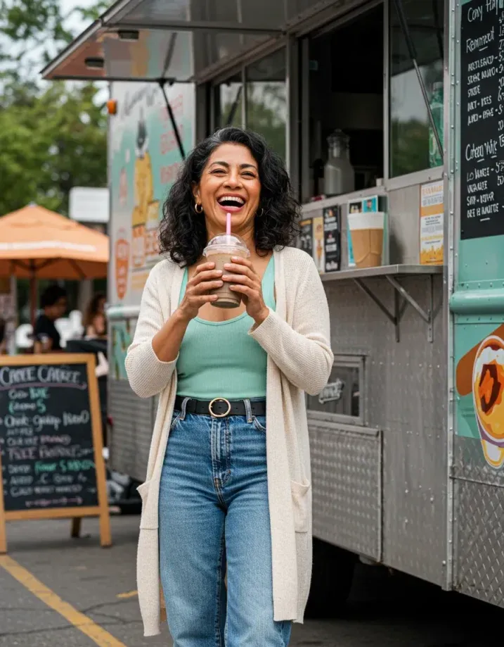 This outfit is playful, comfy, and full of feel-good energy. She s wearing a mint green ribbed tank tucked into high-rise medium-wash jeans, cinched perfectly with a sleek black belt and gold buckle. Layered over is a long cream cardigan that adds softness and warmth. Her hoop earrings, radiant smile, and iced coffee in hand make the whole look feel effortlessly happy and weekend-ready.