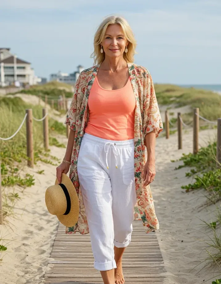 I m honestly obsessed with how easygoing and flattering this outfit is. It s giving vacation mode, but still feels put-together enough to wear around town. The coral shade is such a fun way to brighten up the look, and the kimono adds movement that just makes everything feel so alive and youthful. If I had to pick a go-to summer look, this would be it. It s cute, cool, and totally carefree.