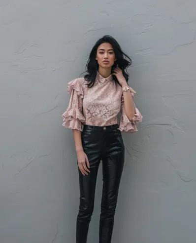 This outfit combines a feminine blush lace top with statement ruffle sleeves and sleek black leather pants, creating the perfect mix of soft and bold. The high-waisted pants hug the figure beautifully, while the top brings all the romance with its delicate details. Strappy black heels complete the look, adding a touch of sophistication to the edgy-meets-chic aesthetic.