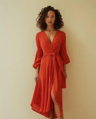 This gorgeous outfit features a stunning red wrap dress with a flowy, asymmetrical hemline that sways with every step. The plunging neckline adds a touch of romance, while the waist tie cinches in perfectly, creating that dreamy hourglass silhouette. The three-quarter puff sleeves keep it playful and feminine, and the thigh-high slit is just the right amount of flirty. Paired with strappy nude heels, this look strikes the perfect balance between elegance and allure.