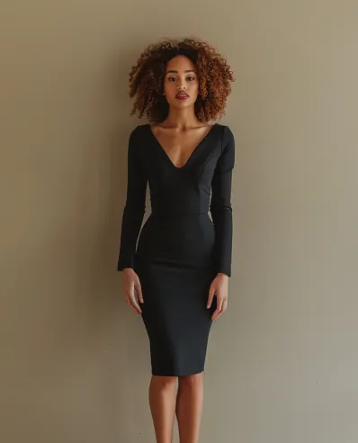 This outfit is the epitome of elegance, featuring a sleek black bodycon dress with long sleeves and a deep V neckline. The figure-hugging silhouette flatters every curve, keeping it timeless yet subtly sultry. Paired with bold red pointed-toe heels, this look transforms from minimalist to statement-making in the best way possible.