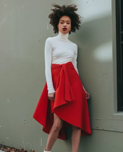 This outfit combines a bright red asymmetrical wrap skirt with a clean white turtleneck for a stylish contrast. The dramatic bow detail on the skirt adds a playful and eye-catching element, while the sleek turtleneck keeps the look sophisticated. Finished with white ankle boots, this ensemble is the perfect blend of modern and cozy for a chilly Valentine s date.
