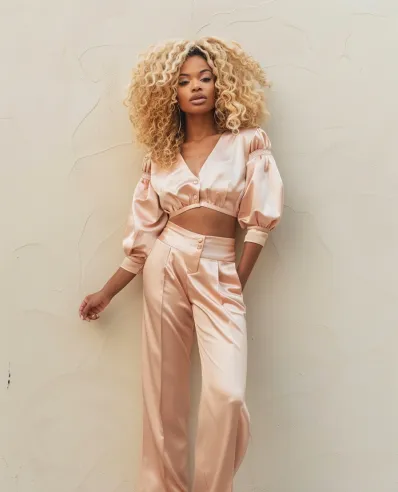 This glamorous champagne satin co-ord features a cropped blouse with puff sleeves and tailored high-waisted trousers. The silky fabric shimmers beautifully, giving it a luxurious vibe, while the cropped top adds a playful twist. Finished with strappy white heels, this outfit is a perfect blend of sophistication and fun.