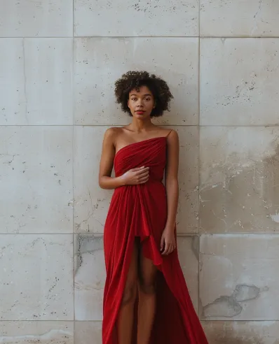 This stunning one-shoulder red gown is pure elegance with a touch of daring. The draped fabric cascades beautifully, creating a flattering silhouette, while the thigh-high slit adds a bold, flirty element. The floor-length hem and rich red color make it perfect for a formal Valentine s evening, and the classic black heels complete the look with understated sophistication.