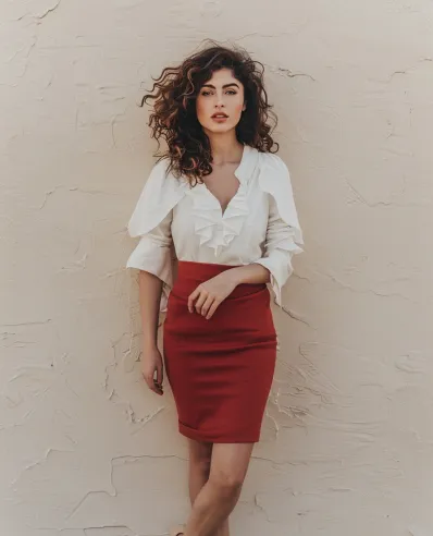 This outfit pairs a crisp white blouse with delicate ruffle details and three-quarter sleeves with a striking red pencil skirt that hugs the body perfectly. The high-waisted skirt accentuates the silhouette, while the soft ruffles on the blouse add a touch of romance. Nude pointed-toe heels complete the ensemble, making it effortlessly elegant and polished.